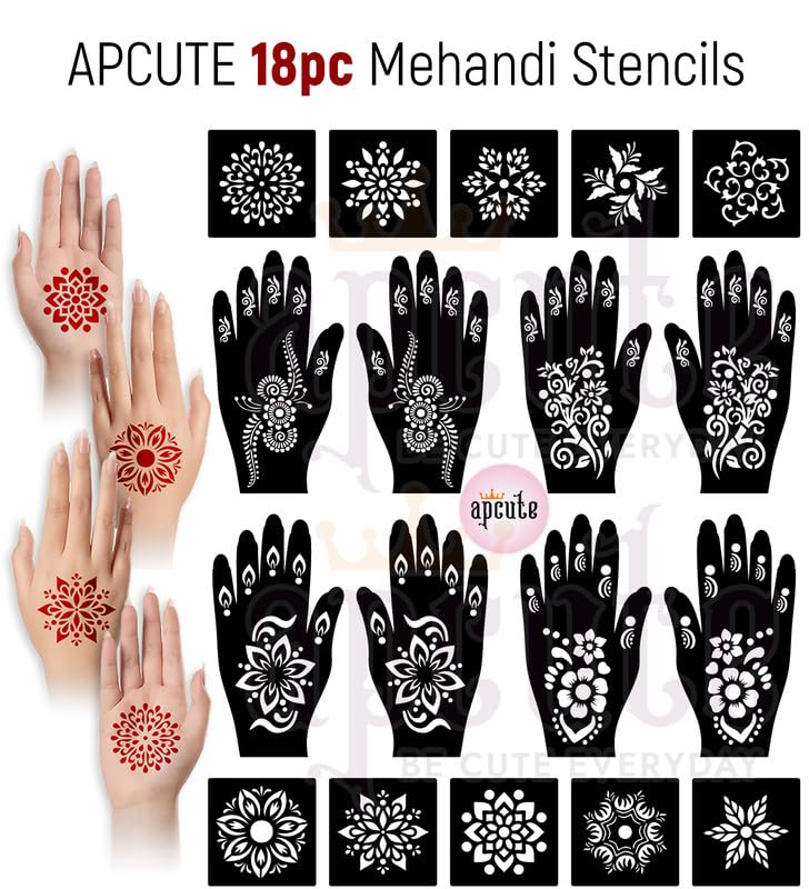 Apcute Temporary Mehndi Tattoo Mehendi Stencil for Full Hand Set of 18 pc Combo Pack Mehandi Stencils for Women, Girls and Kids, Easy to Use in Just 4 Steps