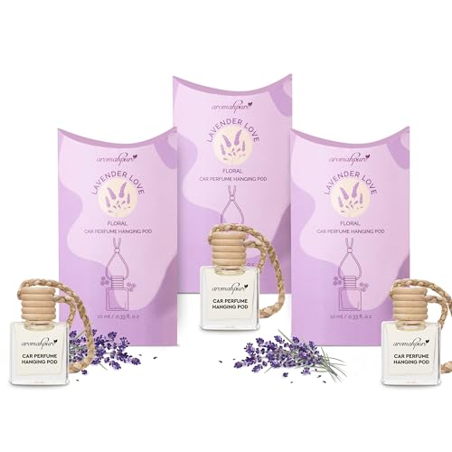 Aromahpure Premium Car Perfume Hanging Pod |10 ML |Lavender Fragrance Car Air Freshener |Natural Essential Fragrance Oils in Glass Bottle with Wooden Diffuser Lid |Long Lasting upto 60 days (Pack 3)