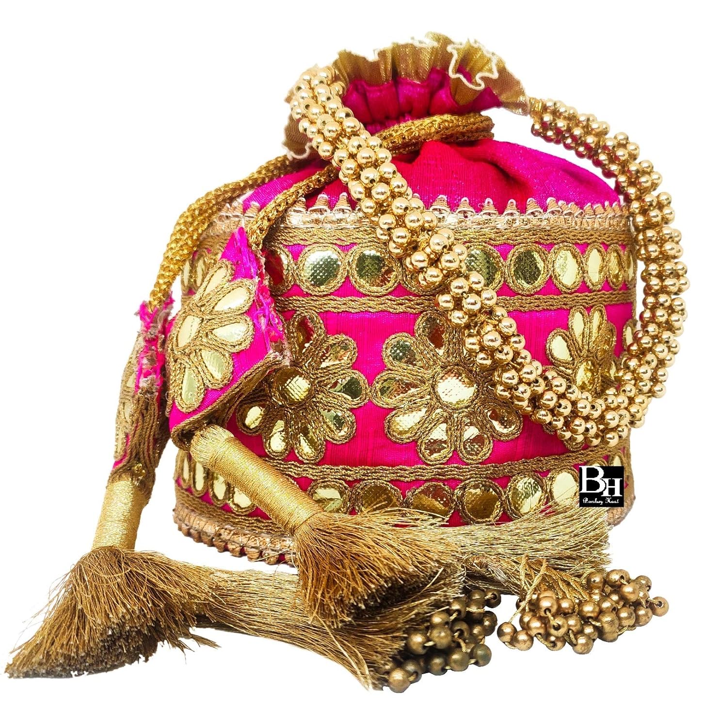 The USP of this BAG is it’s mesmerizing GOTA PATTI WORK Embroidery and it’s shape which is flat from Surface that gives potli a very stunning look.