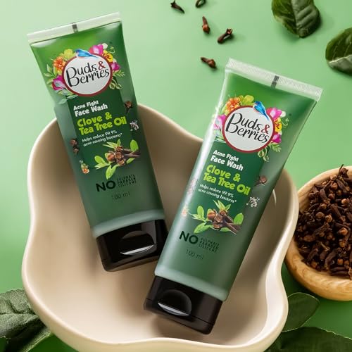Buds & Berries Clove and Tea Tree Oil Acne Fight Face Wash, Helps Clear Blemishes and Spots | pH Balanced Gentle Facewash | No Sulphate, No Paraben | 100 ml
