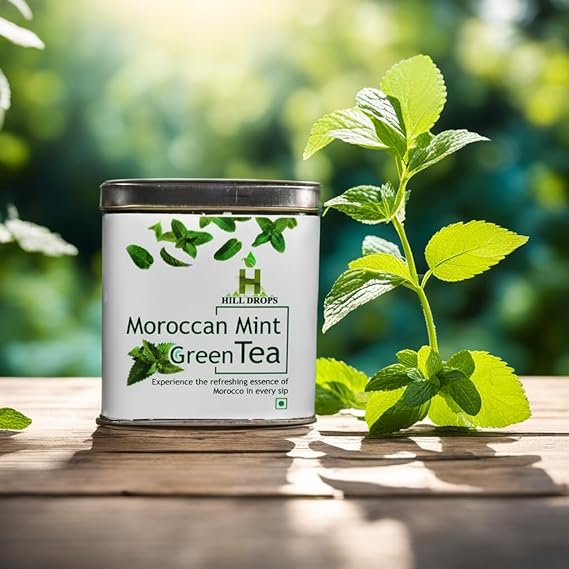 Hill Drops Moroccan Mint Green Tea | 100g Tin Can | A Taste of Morocco's Magic (FROM INDIA SAB)