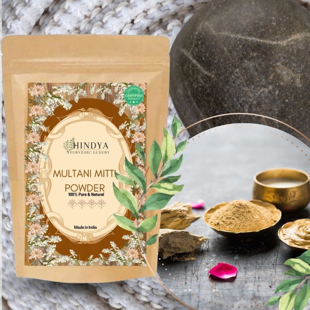 "Product Title": "Hindya Ayurvedic Luxury Multani Mitti Powder for Face Pack | 100% Natural Multani Mitti powder for Face, Skin and Hair| Healing Clay | Fuller's Earth | Bentonite Clay 200g",
