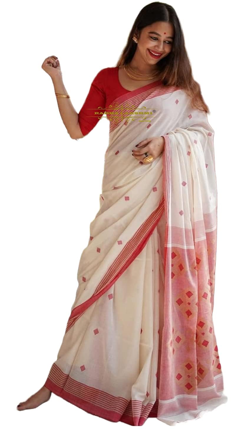RADHA LAKSHMI Women's Banarasi linen cotton Silk White Red Colour Saree With Blouse piece(AG White red plain linen SQURE) | Colombo Mall | Colombo Mall