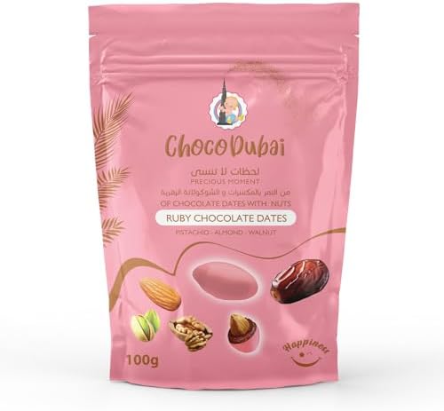 "Ruby Chocolate Dates Stuffed with Pistachio, Almond, and Walnut - 100g | Exquisite Dates Enrobed in Ruby Chocolate with a Crunchy Nut Filling" FROM INDIA (SAM)