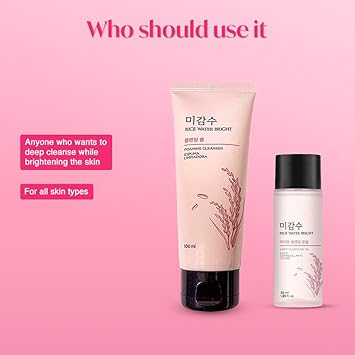 The Face Shop 2 Step Rice Water Bright Kit offers a complete deep cleansing routine suitable for all skin types. The kit includes a lightweight cleansing oil that effectively removes waterproof makeup, impurities, and SPF while hydrating and nourishing the skin with jojoba oil. Followed by the brightening foaming face wash enriched with rice water and rice bran extracts, it gently cleanses dirt and refreshes the skin. This duo helps brighten, clarify, and hydrate, leaving your skin clean, soft, and radiant without any dryness.