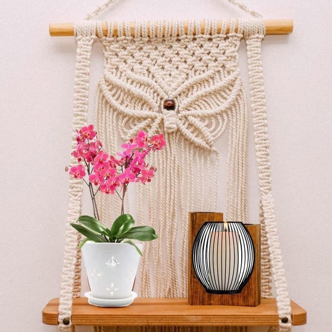 Design: Intricate macrame weaving, creating a beautiful and bohemian-style shelf