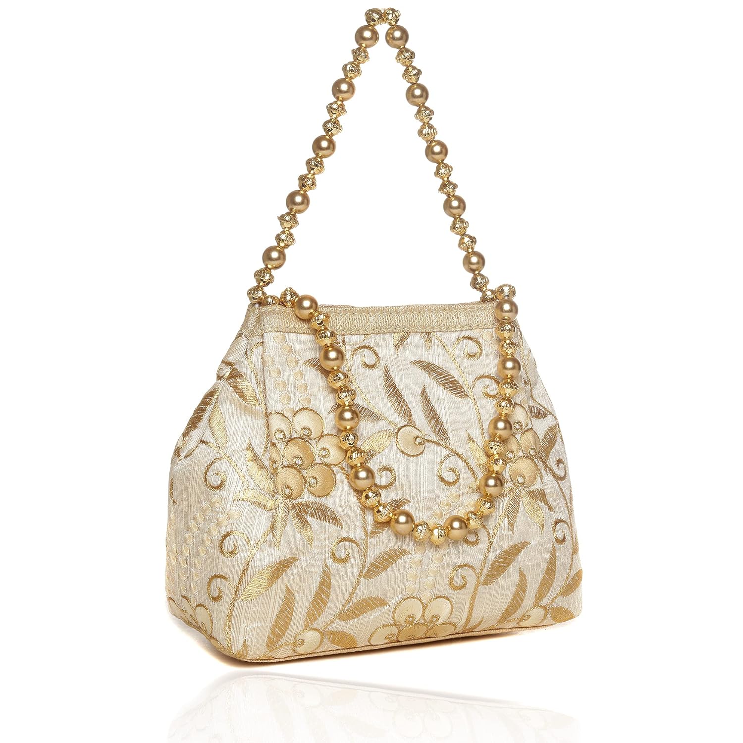 Wenz Raw-Silk Designer Potli Bag for women with Golden Embroidery and Golden Pearl Handle Tassel