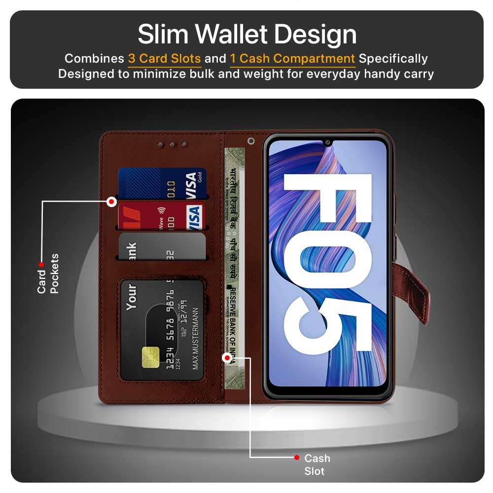 WOW IMAGINE Shock Proof Flip Cover Back Case Cover for Samsung Galaxy F05 | Galaxy M05 | Galaxy A05 (Flexible | Leather Finish | Card Pockets Wallet & Stand | Chestnut Brown) (FROM INDIA FAAZ)